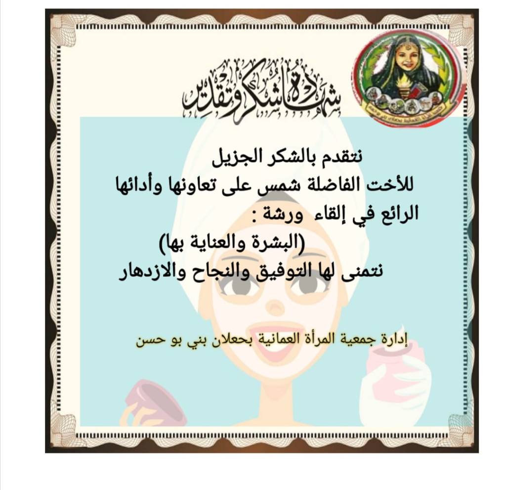 نظمت اللجنة الثقافية والإجتماعية بجمعية المرأة العمانية بجعلان بني بوحسن ورش عمل إسبوعية لفن المكياج والإعتناء بالبشرة للفاضلة/ شمس خبيرة التجميل والمكياج.