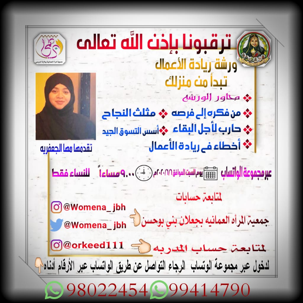 نظمت اللجنة الإجتماعية بجمعية المرأة العُمانية بجعلان بني بوحسن ورشة بعنوان (ريادة الأعمال تبدأ من المنزل) بالتعاون مع جمعية المرأة العُمانية بالبريمي وذلك يوم السبت الموافق 6 /6 /2020م.